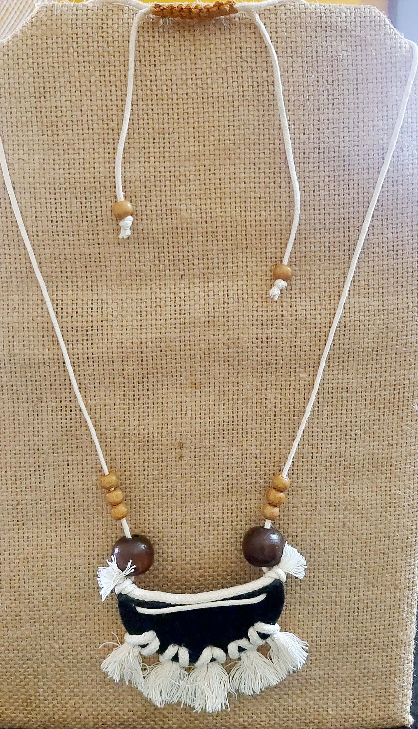 Colar longo regulável. Em feltro, cordão cru encerado, contas de madeira, e mini tasseis em algodão cru.